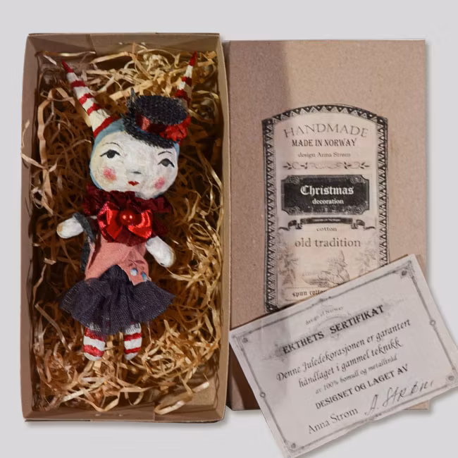 Annas legger kjærlighet og håndverk i alle detaljer og figurer, så det virkelig blir både ett kunstverk og samleobjekt. Selv boksen for julepynt er håndlaget.